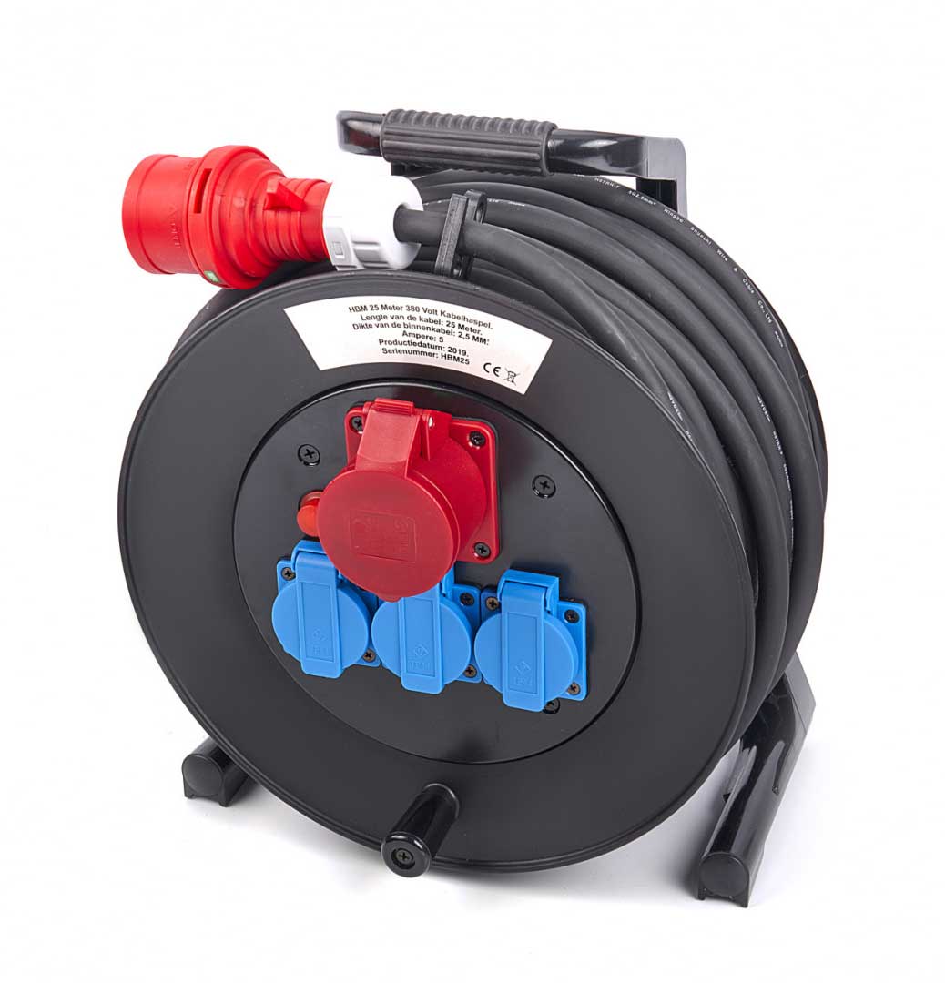 Kvalitní prodlužovací kabel s navíjecím bubnem pro 3-fázová a 1-fázová zařízení s 16A 5ti kolíkovým připojením.