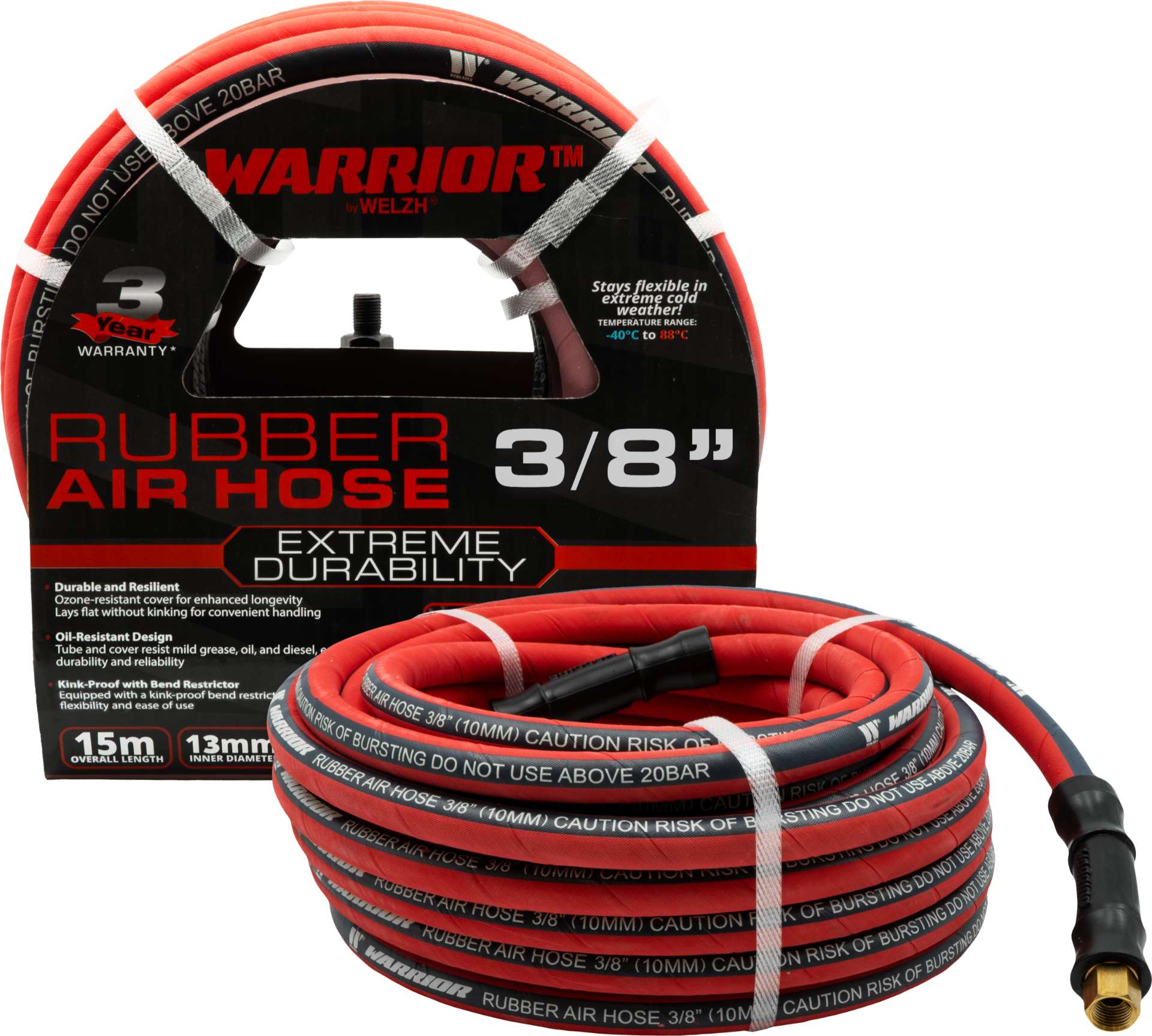 Gumová tlaková vzduchová hadice Warrior™ 3/8'' x 15 m, 300 PSI (20 baru), Welzh