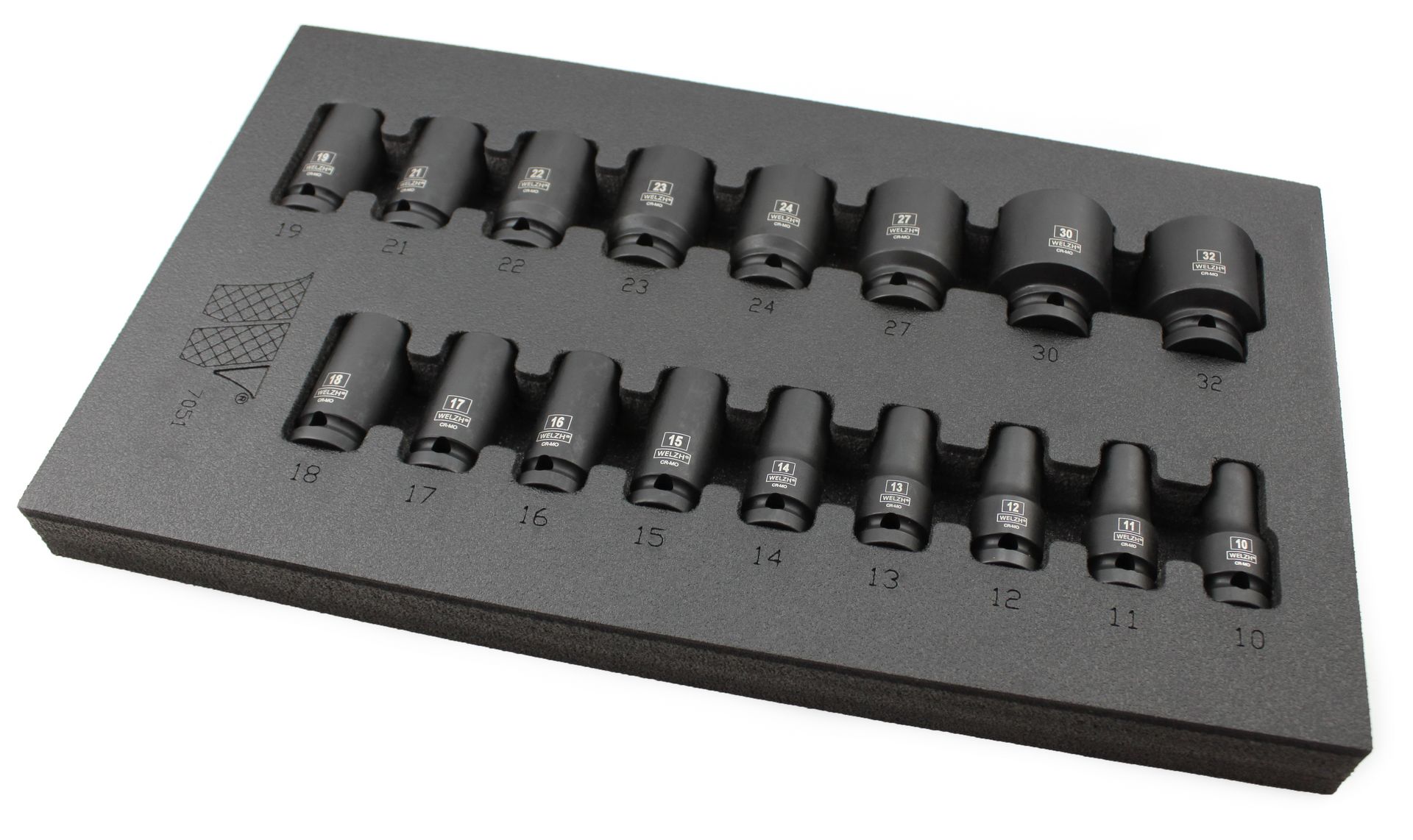 Hlavice nástrčné 1/2", 6 hran, pro rázové utahováky, CrMo, 10-32 mm, sada 17 dílů, Welzh