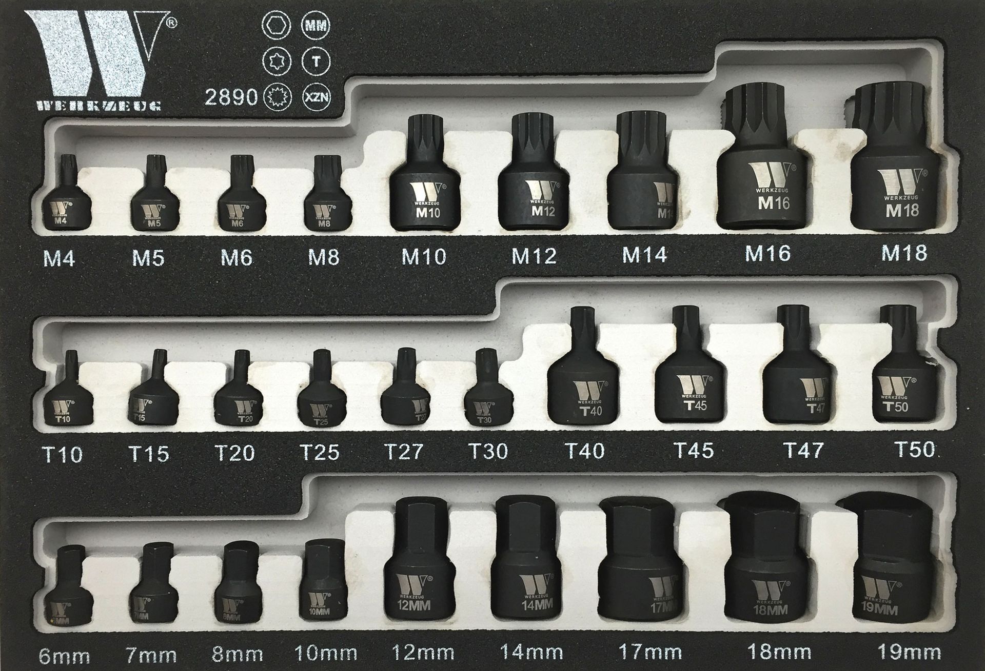 - Hlavice zástrčné, Torx T10-T50, Inbus H6-H19, XZN M4-M18, extra krátké, sada 28 dílů, Welzh