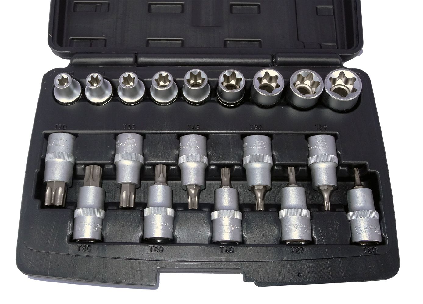 - Hlavice zástrčné a nástrčné 1/2", Torx T20-T70 a E-profil E10-E24, sada 19 dílů, Welzh