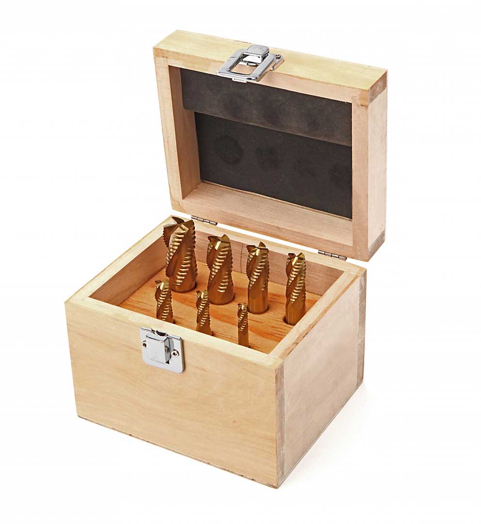 - Sada se skládá z následujících stopkových fréz se 4 břity: 6 - 8 - 10 - 12 - 14 - 16 - 20 mm
