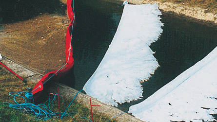 1. Pomocí upevňovacího lana natáhněte lapač napříč tokem. Ropná látka se rychle nasává do vláken až do úplného nasycení sorpční kapacity (souvislé tmavé zbarvení textilie).
