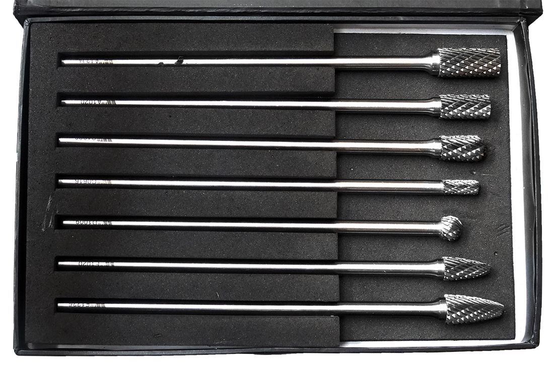 - Karbidové stopkové frézy různých tvarů, extra dlouhé, sada 7 kusů, Welzh