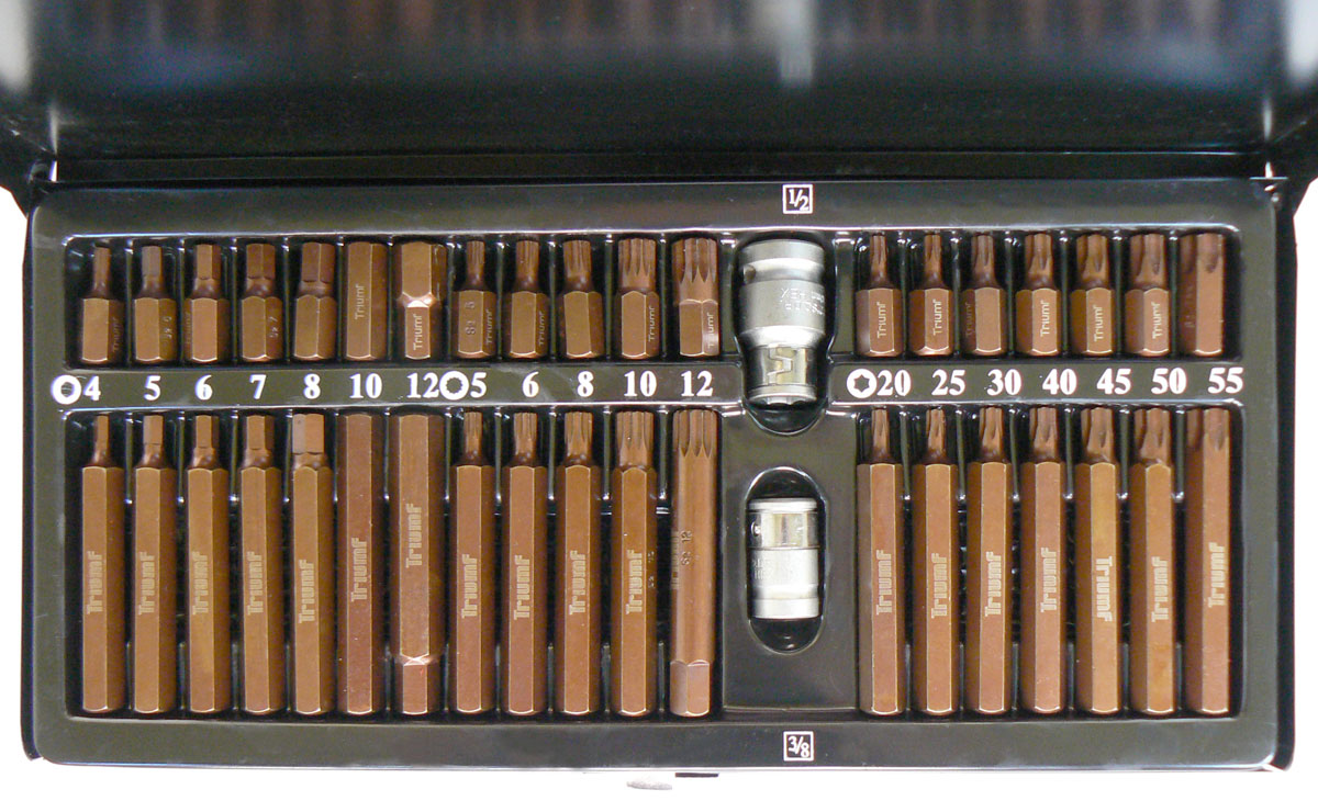 - Kombi sada bity 10mm, Inbus, Torx, XZN, adaptér 3/8", 1/2", 40ks, ocel S2, Triumf