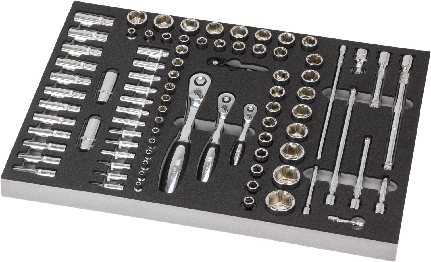 - Tyto robustní průmyslové pěnové zásobníky jsou předem nařezány a naplněny řadou hlavic, prodloužení a ráčen