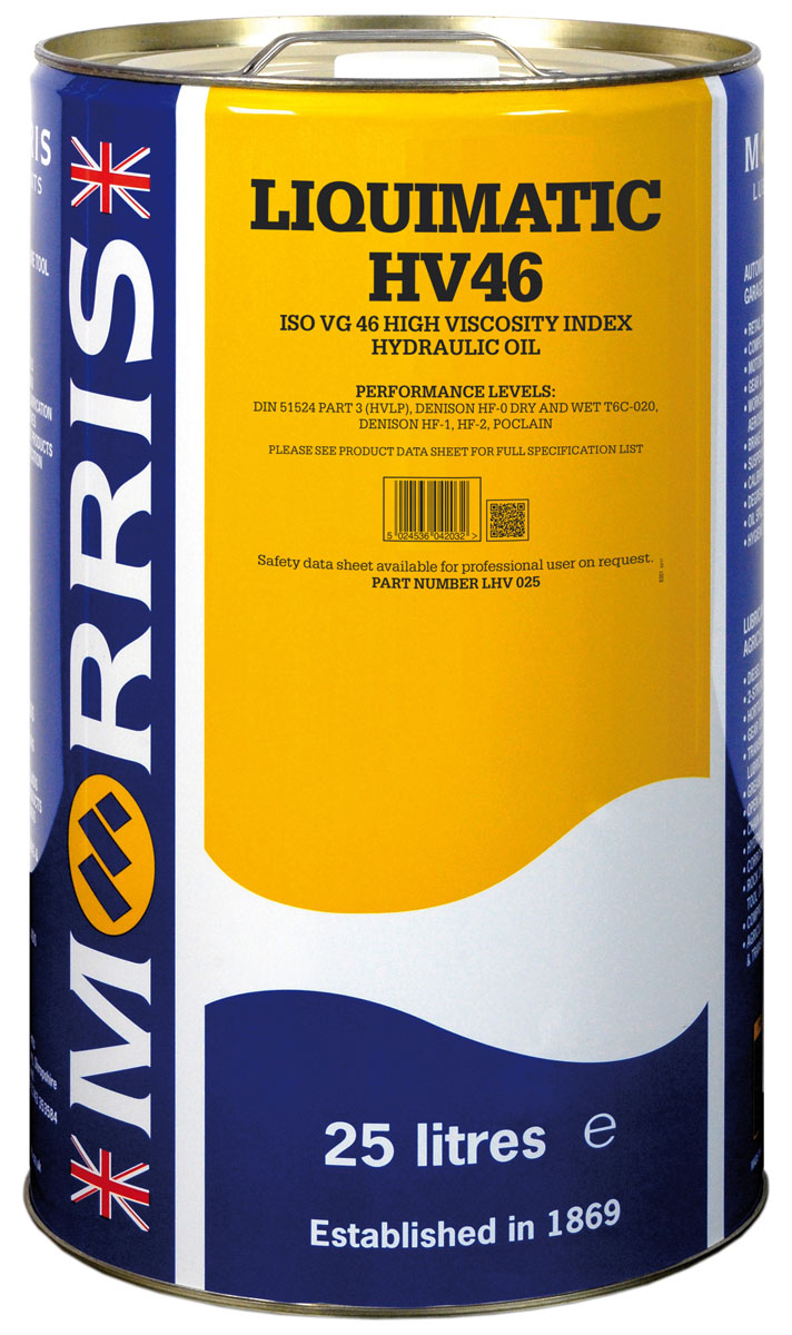 Morris Liquimatic HV je řada hydraulických olejů s vysokým viskózním indexem, které jsou vyrobeny z vysoce kvalitních základových minerálních olejů doplněné o nejnovější aditivní technologie proti opotřebení. Tyto stupně využívají polymer, který je stabilní na střih a který zajišťuje, že oleje během své životnosti neztratí svoje vlastnosti. Jsou ideální pro hydraulické systémy vystavené velmi extrémním provozním podmínkám a teplotám, od skladů zmrazených potravin (-20°C) až po průmyslové hydraulické systémy při zvýšených teplotách a také pro stavební stroje.