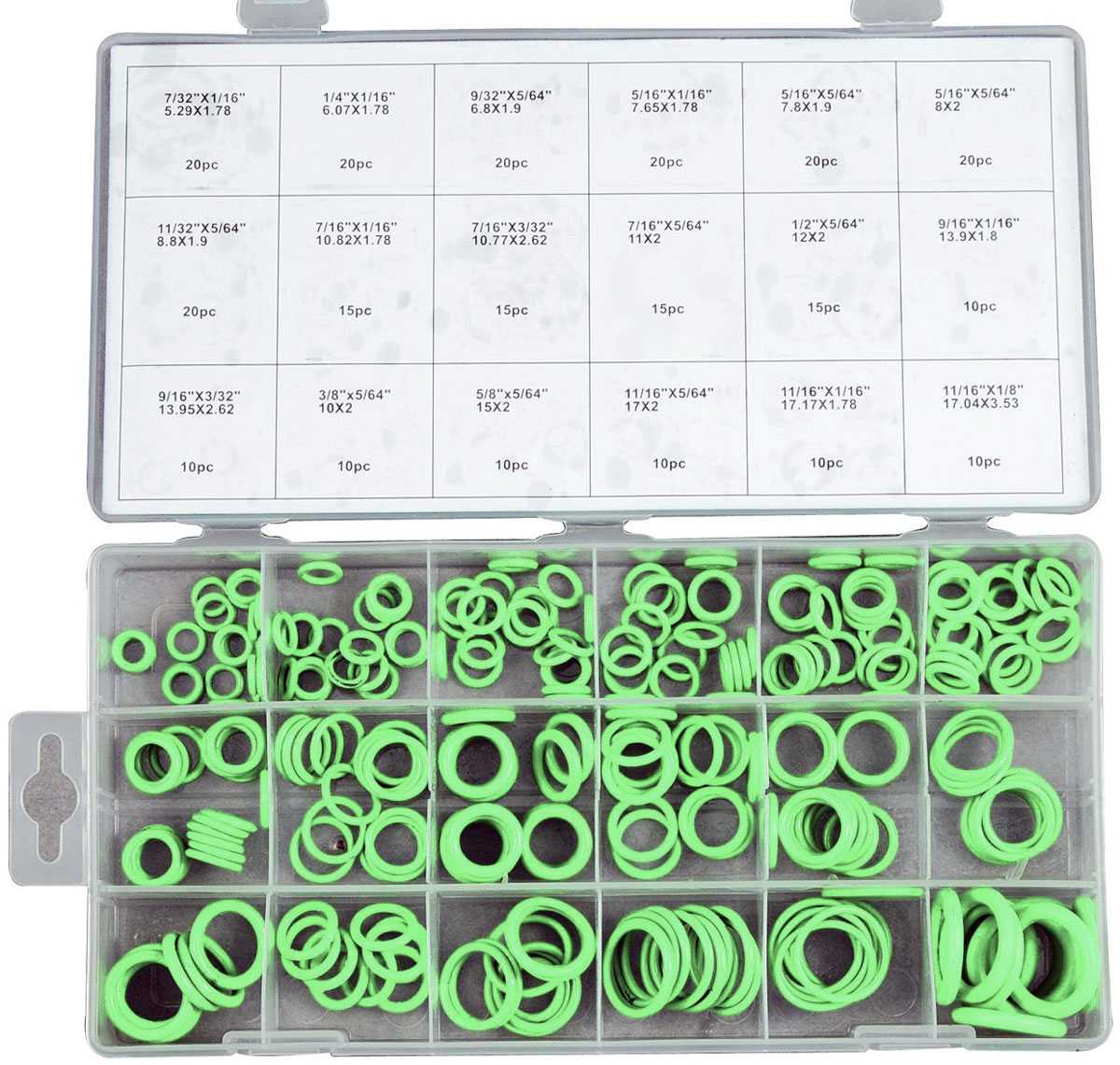 Sada O-kroužků pro klimatizační potrubí odolné chladivu a oleji, 225 dílů v plastové kazetě.