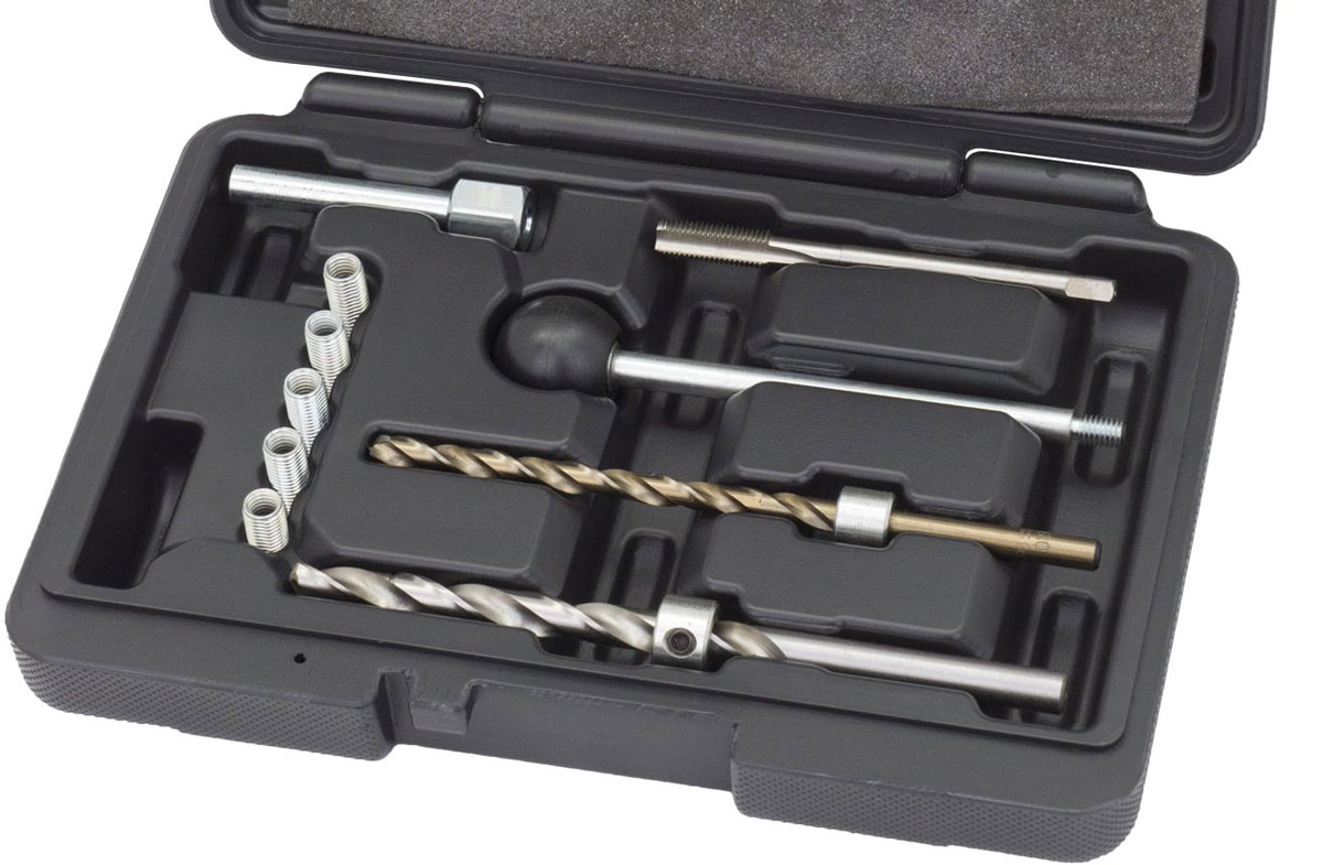 - Sada pro opravu závitů injektoru poskytuje speciální nástroje potřebné k vyvrtání rozlomeného šroubu a vložení závitových vložek M6, aby bylo možné použít nové šrouby OEM M6.