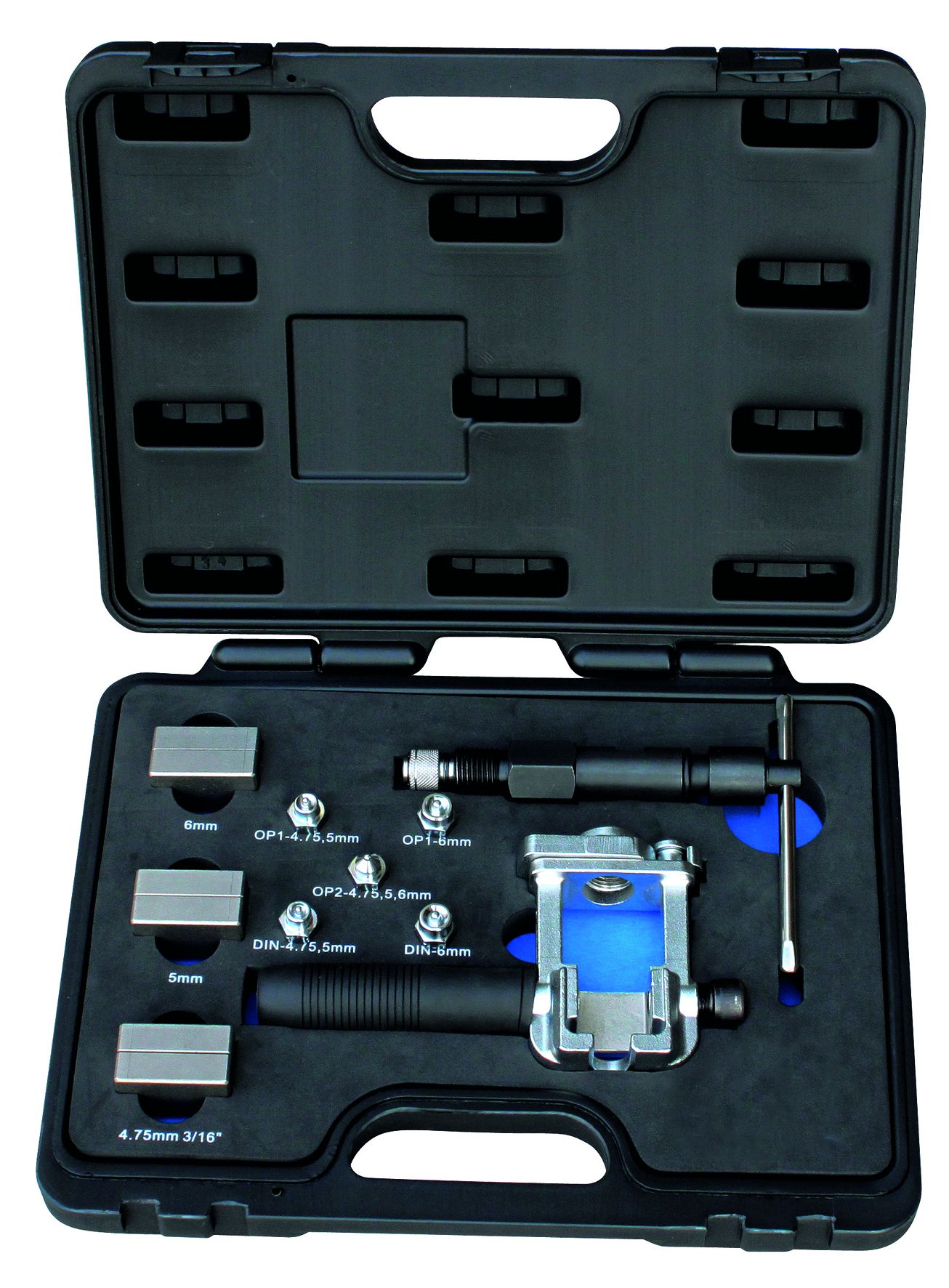 Profesionální provedení na všechny druhy potrubí. Sada obsahuje základní přípravek s rukojetí umožňující pertlování potrubí i přímo na vozidle. 3 kleštiny na potrubí průměrů 4,75 - 5 - 6 mm adaptéry na výrobu koncovek DIN + SAE + SAE kombinovaná. Lisovací přípravek s hydraulickým pístem značně usnadňuje lisování zejména ocelových potrubí.