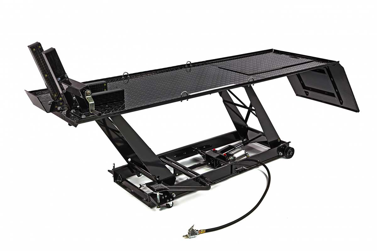 - Pneumatický a hydraulický motocyklový zvedák 300, zvednutí až 450 kg, luxusní upínací háky, hmotnost 150 kg, černý