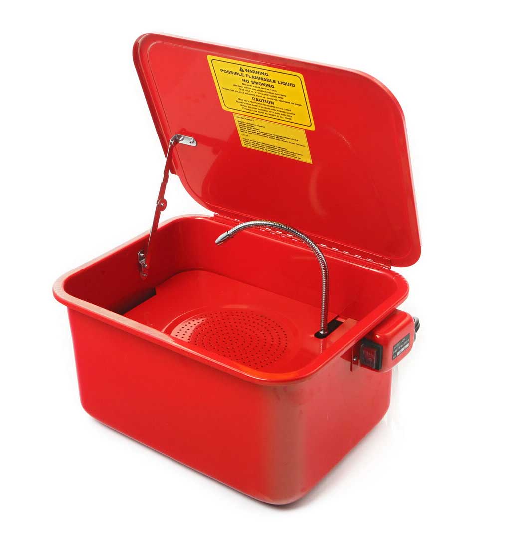 Malý dílenský čistič dílů a součástek s cirkulačním zařízením a nádrží na 15 l.