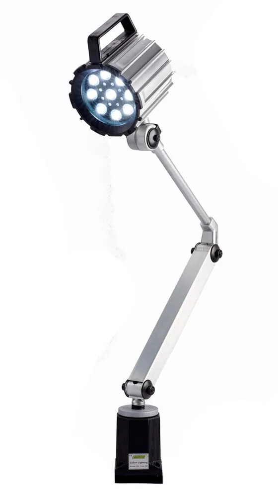 Tato lampa pro dílny má robustní konstrukci, průmyslový design, ideální pro použití se stroji, jako jsou soustruhy nebo frézky. Světlo má nastavitelné kloubové rameno, rychlé a snadné nastavení.