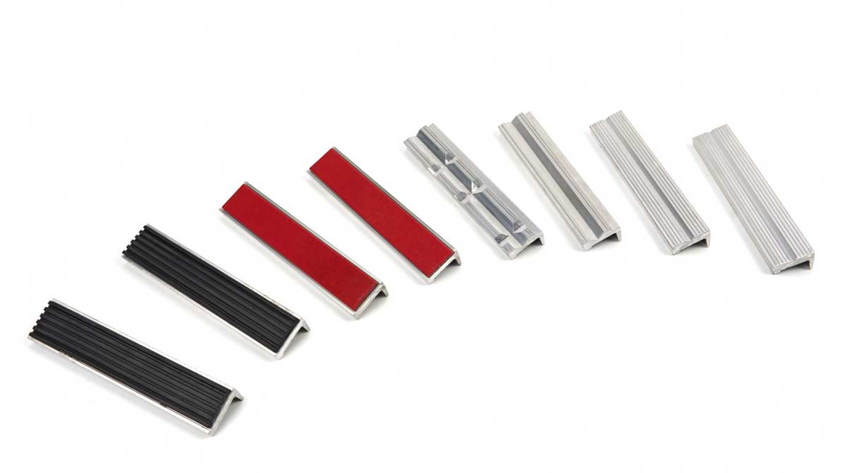 Tyto hliníkové magnetické horní čelisti jsou opatřeny gumovými upínacími plochami, ve kterých byly vytvořeny drážky.Tyto drážky poskytují nejen větší přilnavost, ale také schopnost upnout kulaté nebo polygonální objekty.Magnety jsou vyfrézovány do zadní části těchto čelistí a sestávají z magnetických proužků oxidu železa (prášek oxidu železa ve směsi s gumou).Výhodou těchto magnetických proužků je, že nejsou křehké (na rozdíl od magnetů ze vzácných zemin nebo neodymu).Výsledkem je, že tyto magnety nikdy neztratí malé třísky, které pak mohou skončit mezi svorkou stroje (nebo svěrákem) a horní čelistí a způsobit, že se již nebudou správně spojovat.Magnetická síla těchto magnetů z pryže z oxidu železitého je také taková, že horní čelisti jsou správně přitahovány ke svorkě (nebo svěráku), aniž by magnetizovaly váš obrobek.