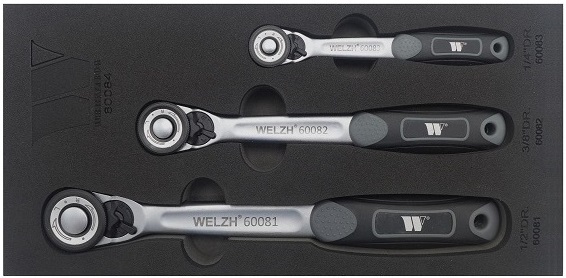 - Sada ráčen 1/2", 3/8", 1/4", CrV, ultra tenké, s přepínací páčkou a vyhazovákem, 3 ks, Welzh