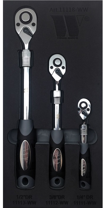 - Sada teleskopických ráčen s přepínací páčkou a vyhazovákem 1/2", 3/8", 1/4", 72 zubů, 3 ks, Welzh