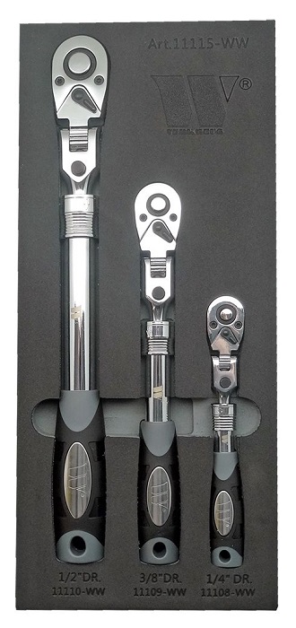 - Sada teleskopických ráčen s výkyvnou a uzamykatelnou hlavou a vyhazovákem 1/2", 3/8", 1/4", 72 zubů, 3 ks, Welzh