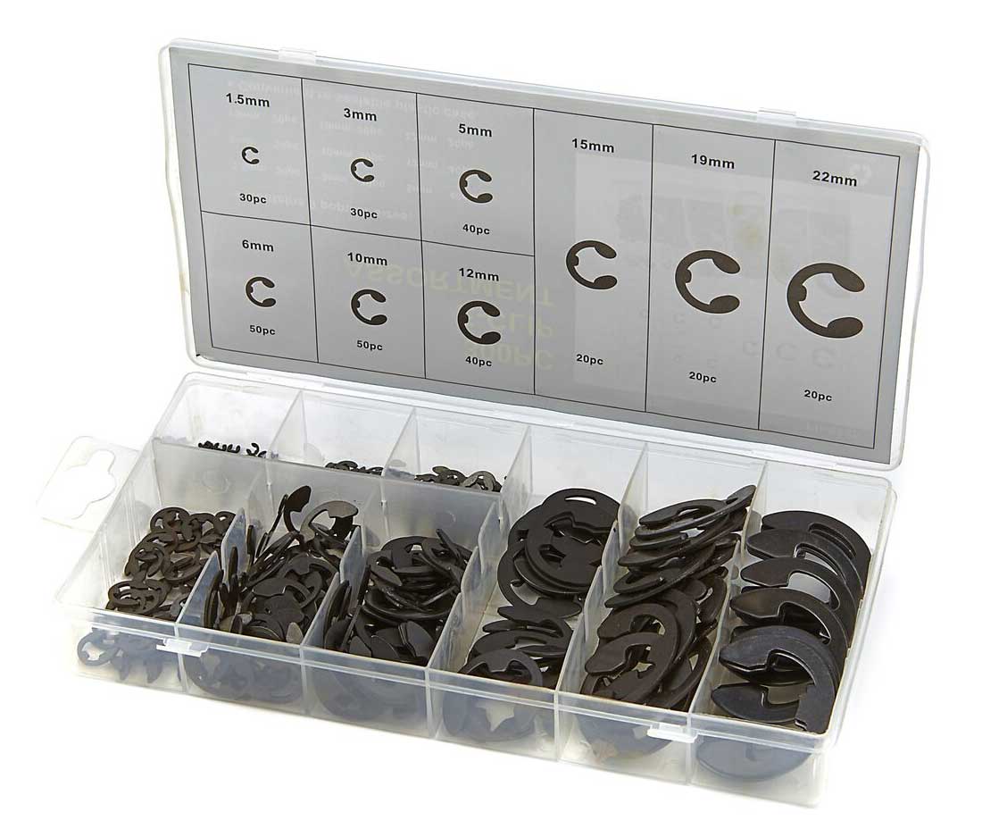 - Sortiment pojistných kroužků třmenové E-clip, sada 300 dílů, průměr 1.5 - 20 mm