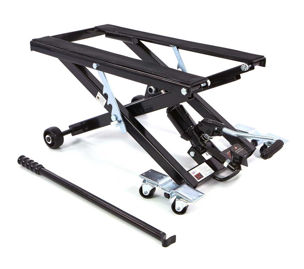 Tento velmi stabilní a přenosný zvedák je dokonalým zařízením, které by mělo mít každý majitel motocyklů Harley Davidson nebo jiných silných motocyklů. Zvedák je zkonstruován speciálně pro motocykly do 500 kg. Díky své jednoduchosti a robustní formě je tento zvedák snadno použitelný pro všechny. Zařízení má čtyři otočná a 2 pevná kola, což umožňuje zvednout motocykl jednoduše za spodek motocyklu. Kromě toho se tento robustní zvedák také snadno ergonomicky ovládá díky nožní operaci a umožňuje snadnou manévrovatelnost. Zvedák umožňuje manipulovat s motocyklem snadno a bez poškození. Vrchní plošina, na které bude stroj umístěn, je opatřena silnou gumovou vrstvou. Díky tomu nikdy nedojde během zvedání k poškození motocyklu. Zvedák lze nastavit do čtyř různých výšek a zahrnuje čtyřfázové zabezpečení. Tato ochrana zajišťuje, že váš zvedák je vždy automaticky zablokován během přerušeného pohybu. Při spouštění lze zvedák jemně tlumit pomocí nožního ovládání.