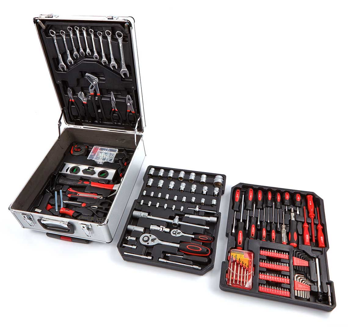 Tento toolbox obsahuje všechny základní nástroje, které by měl mít každý údržbář doma. Vhodný jak DYI mechaniky, tak i pro profesionály. Kufr s nářadím obsahuje kvalitními nástroji vyrobené z vysoce kvalitní chrom vanadiové oceli. Nástroje se vyznačují krásným designem a odolností. Tato sada je používána např. v opravnách automobilů, servisních střediscích, průmyslu a mechanice. Robustní pouzdro obsahuje ráčnu se sadou hlavic, nepostradatelné nástroje pro práci na opravách bicyklů, truhlářské kladivo a vodováha pro všechny truhlářské práce nebo detektor napětí pro práci na elektrozařízeních a mnoho dalších nástrojů pro domácí, zahradní a dílenské. Nástroje jsou dodávány v robustním hliníkovém pouzdře. Krabice na nářadí váží 12,5 kg a má pohodlnou rukojeť. Nástroje lze tedy bez námahy vzít na práci tam, kde je potřeba a budou vždy na dosah ruky. Kompaktní pouzdro má 4 kapsy, takže úhledně organizuje nástroje, které zůstanou vždy přehledně na svém místě. Kufr je uzamykatelný pomocí 2 svorek. Kufr nástrojů obsahuje všechno základní nářadí pro práci v domě a kolem domu. Stručně řečeno, vše v jednom kufru pro práci je připraveno u dveří. Rozměry kufru: 46 x 37 x 18 cm.