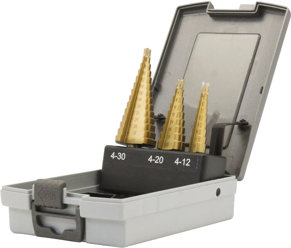 Vrtáky stupňovité 4 - 12 mm, 4 - 20 mm, 4 - 30 mm, sada 3ks, HSS-TiN, WelzhSkladem 1 ks1 039,00 Kč/ ks858,68 Kč bez DPH