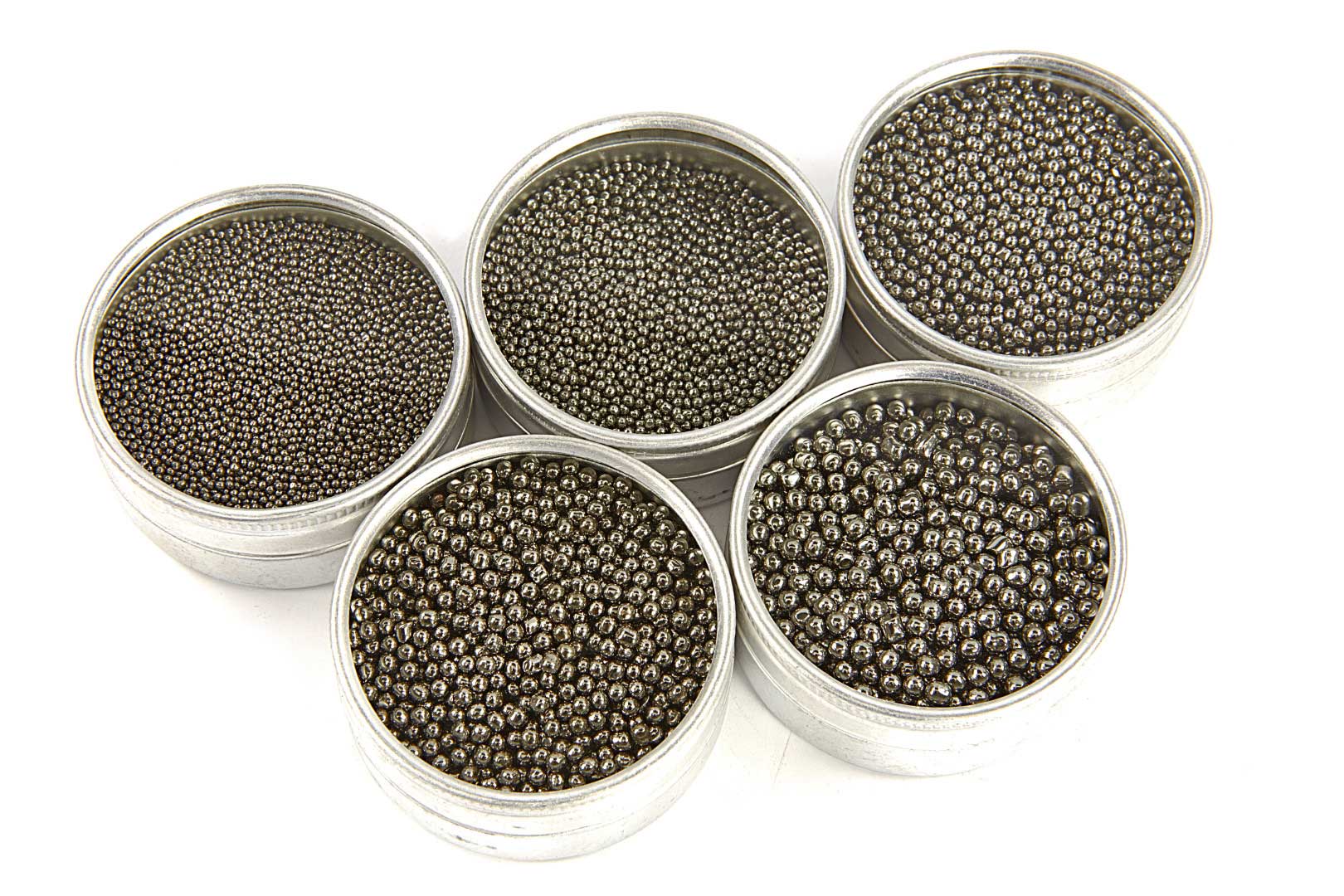 Lešticí kuličky z nerezové oceli pro bubnové leštění drahých kovů, hodinových součástek, šperků, nábojnic a dalších kovových předmětů.