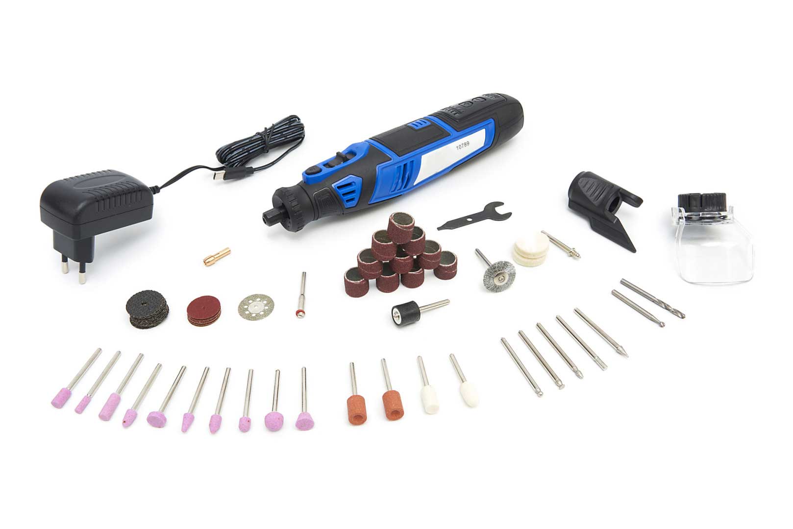 Toto velmi kompletní a dodávané multifunkční nářadí je výkonný 8V elektrický akumulátorový frézovací, brusný, leštící, brousicí a gravírovací stroj, který se velmi dobře drží v ruce.
