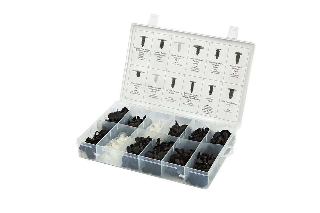 Sortiment plastových spon a svorek na čalounění a plastové díly automobilů, 340 ks