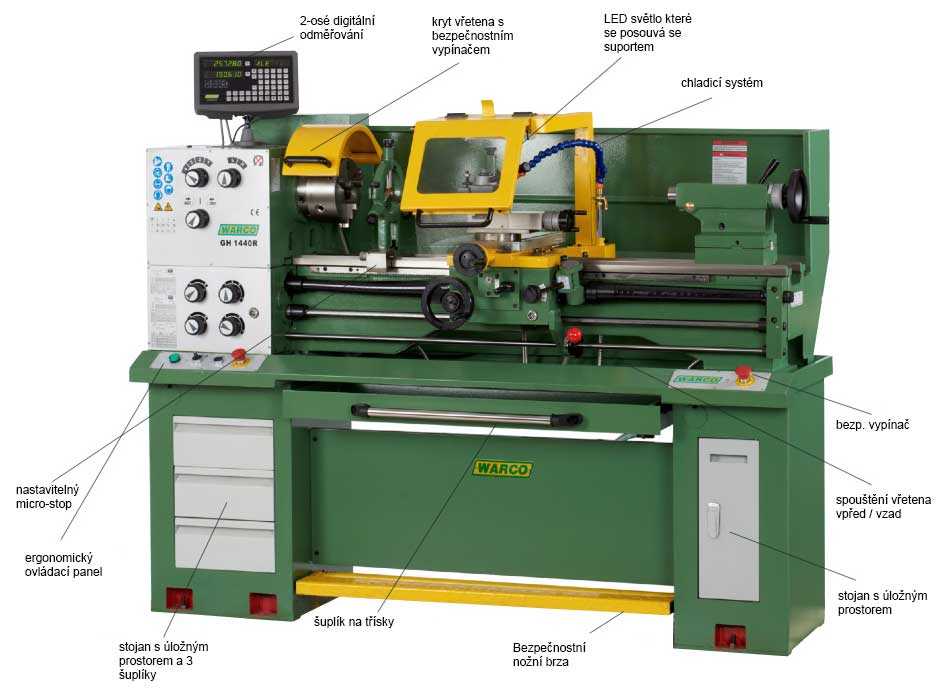 - Warco GH1439, klasický hrotový soustruh na kov s převodovkou, 230 V, 800 kg